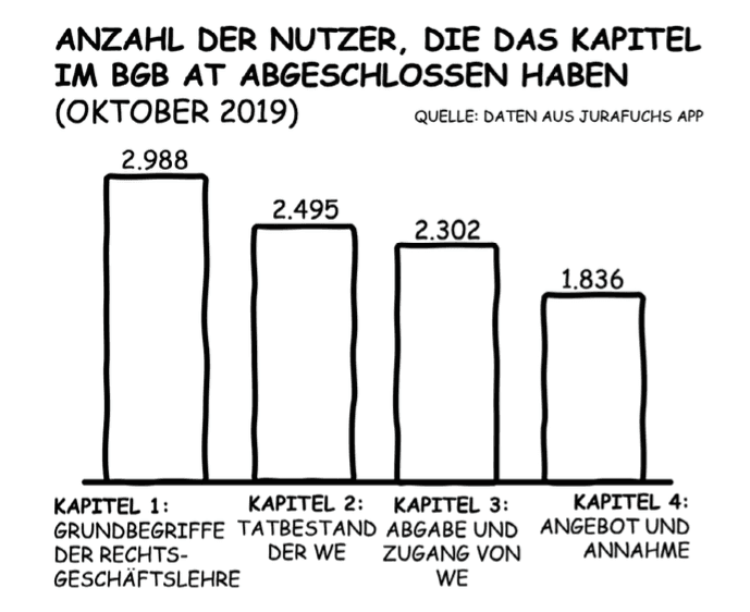 Im Oktober 2019 haben rund 3.000 Nutzer das Kapitel 1 (Grundbegriffe der Rechtsgeschäftslehre) vollständig abgeschlossen. Das zweite und dritte Kapitel (Tatbestand der Willenserklärung bzw. Abgabe und Zugang von Willenserklärungen) haben jeweils rund 2.500 Nutzer abgeschlossen (rund 85%). Das vierte Kapitel haben noch 1.800 Nutzer abgeschlossen (rund 70%). Mit anderen Worten: Über die Spanne von etwa 130 Fällen zu diesen drei Themen ist von Kapitel zu Kapitel jeweils nur ein geringer Teil der Lernenden abgesprungen.