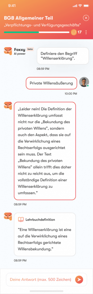 Vorhang auf für Künstliche Intelligenz! Mit unserem KI-gestützen Definitionstrainer können Studierende in einen Chat mit Foxxy – unserer KI-Stimme – eintreten, und sich stundenlang und jederzeit von Foxxy Definitionen abfragen lassen. Die Nutzer müssen den Definitionstext dazu über die Tastatur oder per Spracheingabe eingeben. Foxxy evaluiert den Definitionsversuch und liefert eine Erklärung, inwiefern dieser erfolgreich war oder gescheitert ist und welcher Aspekt der Definition womöglich unvollständig oder falsch war.