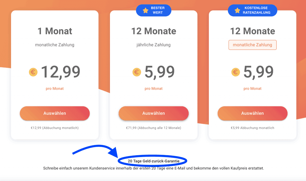 Aus diesem Grund bieten wir über das bestehende 14-tägige gesetzliche Widerrufsrecht hinaus freiwillig in den ersten 20 Tagen nach Kauf des Abonnements eine Geld-zurück-Garantie für alle Abonnements, die über unsere Website (https://my.jurafuchs.de/sub/product) gekauft wurden.