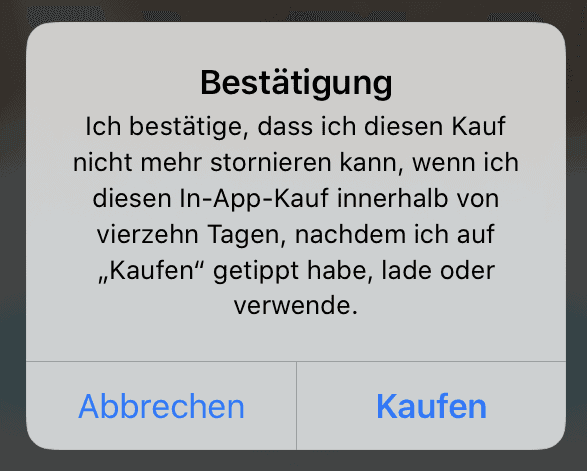 Das Widerrufsrecht besteht nicht, wenn Du ausdrücklich zugestimmt hast, dass die Lieferung beginnt und Du Dein Widerrufsrecht verlierst. Apple blendet dazu (nach eigenen Kriterien, auf die wir keinen Einfluss haben) beim Abo-Abschluss manchen Nutzer:innen dieses (oder ein vergleichbares) Popup ein: