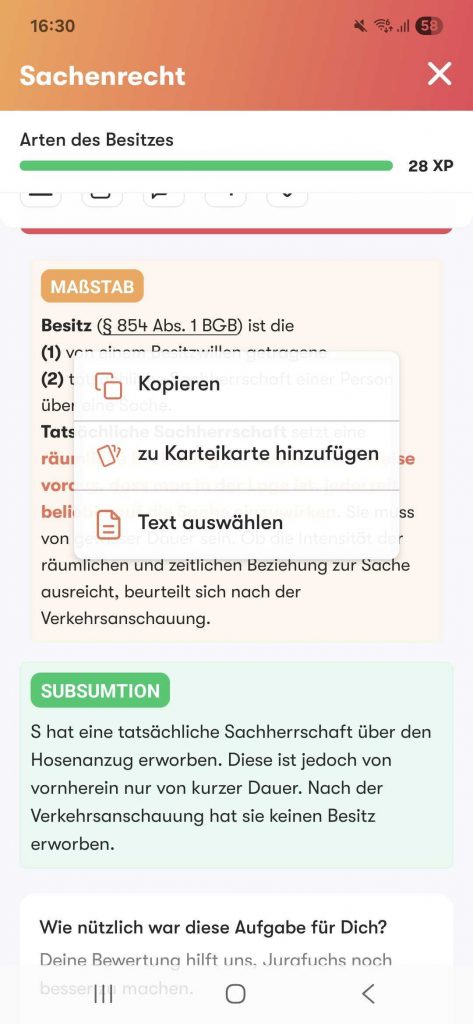 Markiere Inhalte direkt in den Jurafuchs-Fällen und verwandle sie mit einem Klick in deine eigenen Karteikarten. So baust du dir Schritt für Schritt deine persönliche Sammlung auf.