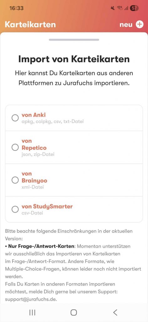Du kannst externe Kartensätze (z. B. aus Anki oder anderen Tools) einfach in Jurafuchs importieren. Damit hast du all deine Karteikarten an einem Ort – übersichtlich und jederzeit verfügbar.