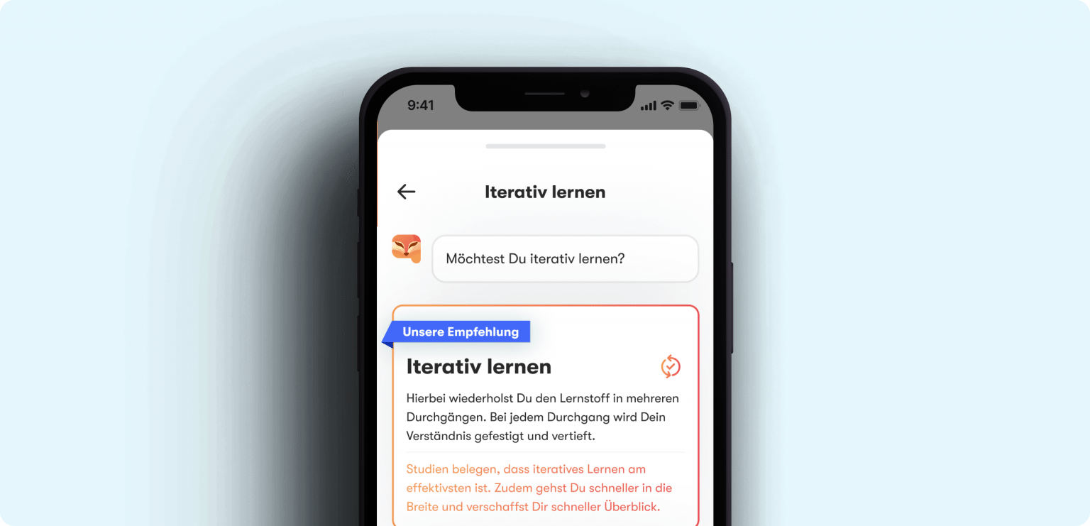 Iteratives Lernen: Hierbei wiederholst Du den Lernstoff in mehreren Durchgängen. Im ersten Durchgang erarbeitest Du Dir zu jedem Thema die Grundlagen. Bei jedem weiteren Durchgang wird Dein Verständnis gefestigt und vertieft.